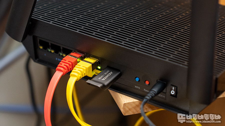 기가비트 랜 포트 4개 / 통신사 인터넷 선이 연결되는 Wan 포트 1개 / USB 3.0 포트 / WPS 및 리셋 버튼 / 전원 소켓 / 전원 스위치 구성을 확인할 수 있습니다.