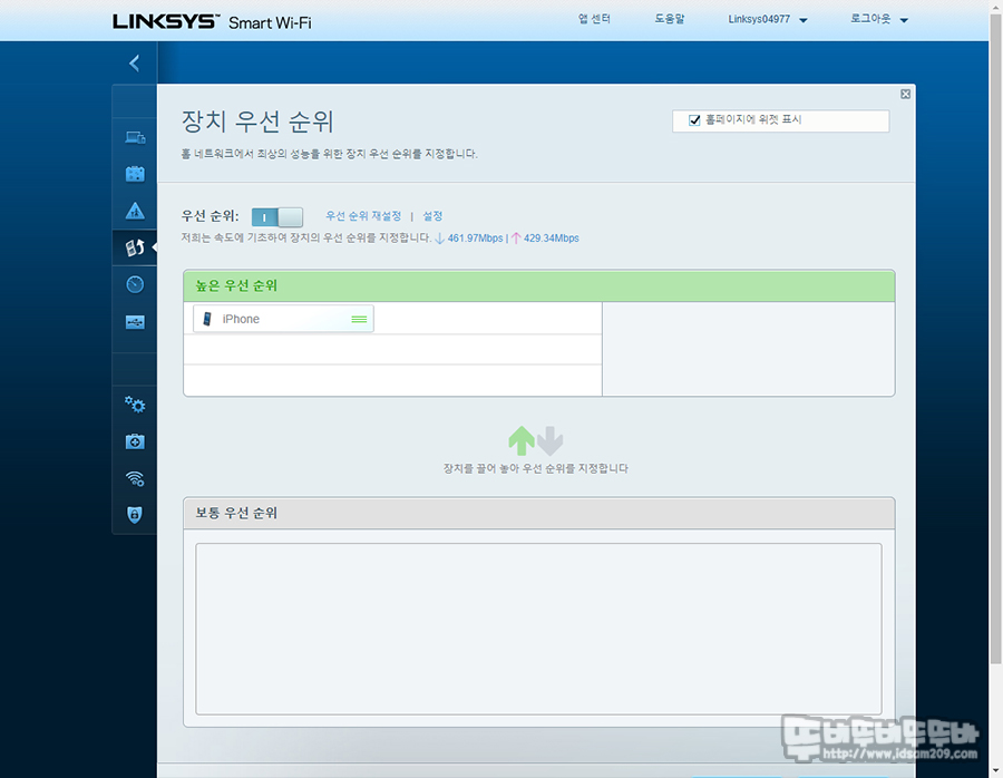 무선 네트워크에 연결된 장치의 속도를 분배할 수 있는 메뉴로 다중으로 접속하는 무선 기기가 많을 때 우선순위를 부여하여 속도를 분배하면 좋습니다.
