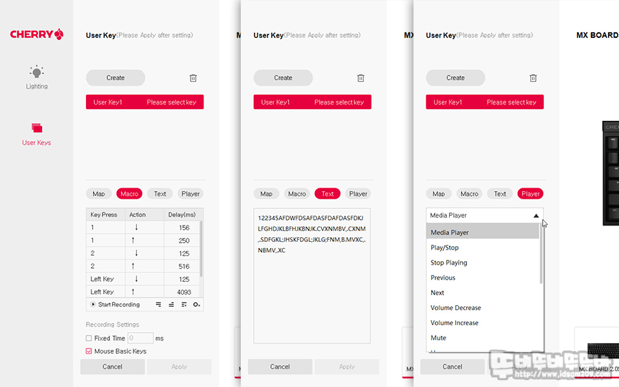 User Key 메뉴에서는 기본 키 기능을 다른 키로 변경하는 키 스왑, 키 프레스 매크로와 텍스트 매크로, 멀티미디어 키 기능을 부여하는 기능을 제공합니다.