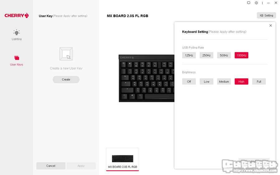 메뉴 우측의 KB Setting 버튼 선택 시 보이게 되는 USB 폴링 레이트와 LED 라이팅 밝기 선택 메뉴.