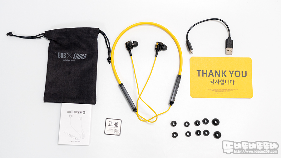 제품은 전용 파우치, 사용 설명서, 정품 카드, 씽크웨이 TONE 밥쇽 BT 본체, USB-C 충전 케이블, 감사 카드와 총 6종의 이어팁으로 구성되어있습니다.