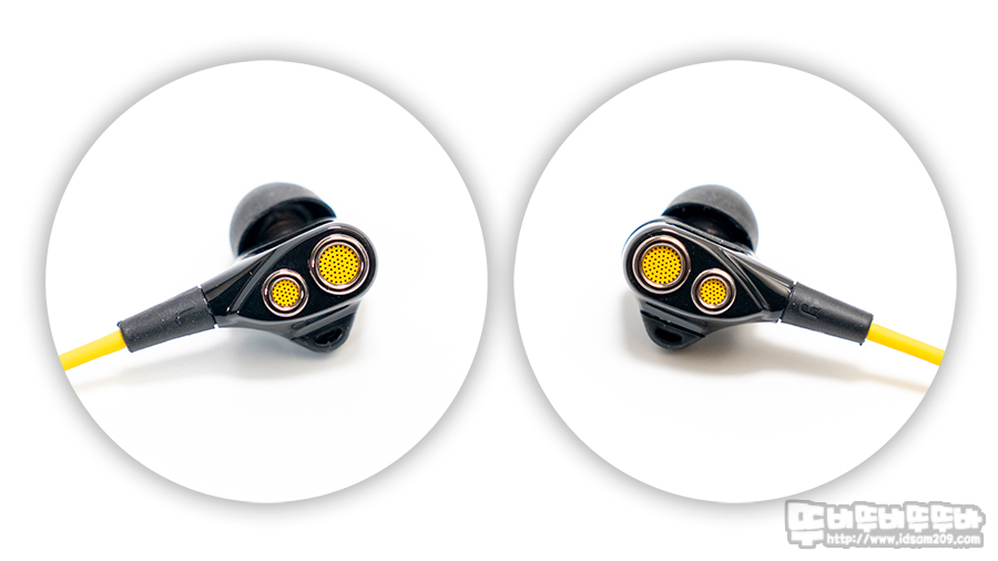 듀얼 6mm 다이나믹 드라이버와 Balance Armature (밸런스 아마추어)가 사용된 이어버드 몰딩 바깥쪽에는 R, L을 구분하는 각인을 확인할 수 있습니다.