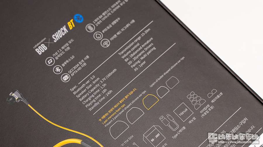 블루투스 5.0 / 넥밴드 디자인 / 6mm 다이나믹 드라이버 듀얼 구성 / BA 드라이버 / 다양한 코덱 지원 (aptX HD / aptX / aptX LL / SBC / AAC ) / 2대 멀티페어링 지원 / USB-C 충전단자 / 3 버튼 컨트롤러 / G모드 (가상 7.1 채널 지원) / IPX5 생활 방수 / 무게 32g / 배터리 용량 160mAh / 충전 시간 약 1시간 30분 / 사용 시간 60% 볼륨 시 약 18시간 / 보증기간 1년 등의 내용을 확인할 수 있습니다.
