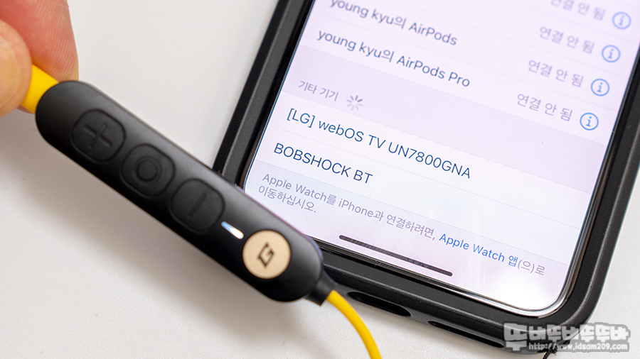 컨트롤 부 중앙의 ◎버튼을 6초간 누르면 페어링 모드로 진입하게 되는데 LED 인디케이트는 화이트/블루 LED가 교차 점멸로 표현되며 음성안내로는 연결 중이라는 안내로 확인이 가능하며 이후 스마트 기기에 블루투스 리스트의 "BOBSHOCK BT"를 선택하면 페어링이 완료됩니다.
