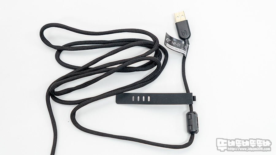 파라코드가 적용된 케이블에는 금도금 USB 단자와 전자파 유입을 차단하는 페라이트 코어 그리고 케이블을 묶을 수 있는 실리콘 밴드가 기본으로 부착되어있습니다.