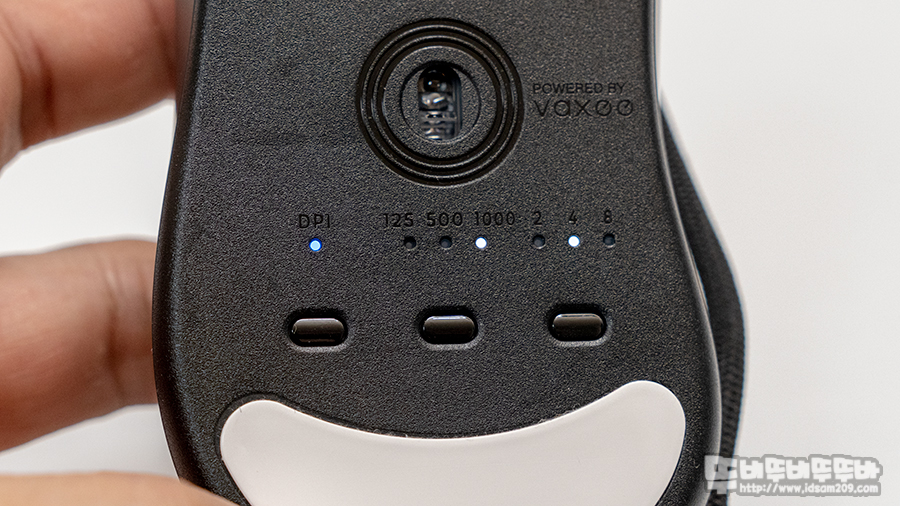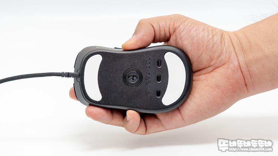 바닥면의 피트는 위/아래부분에 넓은 피트가 적용되어있으며, 아래부분에 DPI / USB 폴링 레이트 / 버튼 반응 속도를 조절할 수 있는 버튼이 위치하고 있는데요.