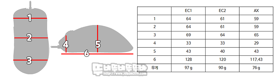 대체로 EC2 제품과 살짝 작은 느낌이지만 하우징 뒤쪽의 좌우 폭과 높이 살짝 높으며 길이를 짧게 하여 그립감을 좋게 디자인된 게 특징이며 무게도 76g으로 경량화하여 손에 촥!! 감기는 느낌을 줍니다.