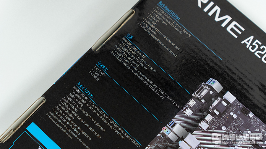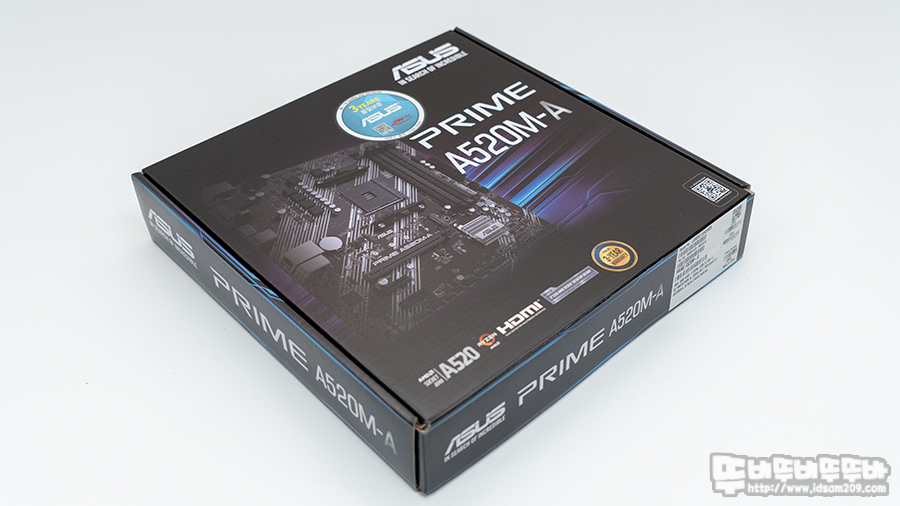 ASUS PRIME A520M-A 대원 CTS 메인보드 패키지에는 제품의 특징을 잘 표현하는 모델명과 A520 칩셋 사용 및 라이젠 3세대 이상 CPU 지원 및 3년의 서비스 보증기간을 안내하고 있습니다.