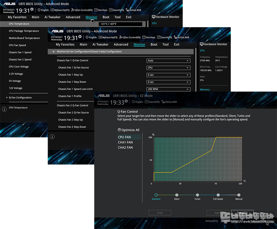또한 Q-Fan 컨트롤을 이용한 CPU 및 SYS팬 컨트롤을 바이오스에서 설정할 수 있지만, 가급적이면 윈도우즈 실행 하에서 사용할 수 있는 FAN Xpert 2+ 앱을 이용하는 것을 추천드립니다.