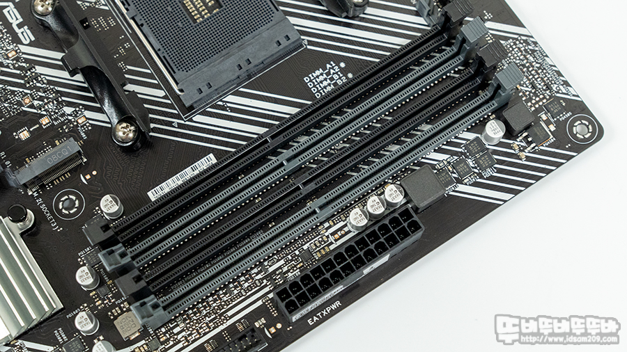 컬러로 구분되는 메모리 슬롯은 듀얼 채널로 구성되어 슬롯당 32GB, 최대 128GB를 사용이 가능하며, 기본 3,200 MHz 클럭과 최대 4,800 MHz 오버클럭을 지원합니다.