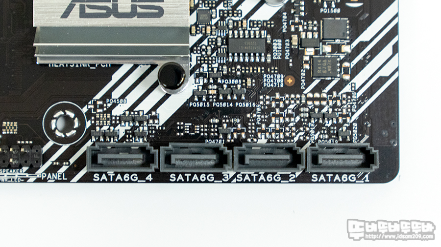 메인보드 24핀 커넥터 옆에는 케이스 전면에 사용하게 되는 USB 3.2 Gen1 헤더가 위치하고 있으며 보드 하단부에는 USB 2.0 커넥터 2개와 케이서 전면의 I/O 커넥터 그리고 SATA 6Gb/s를 지원하는 SATA 커넥터 4개를 지원하고 있습니다.