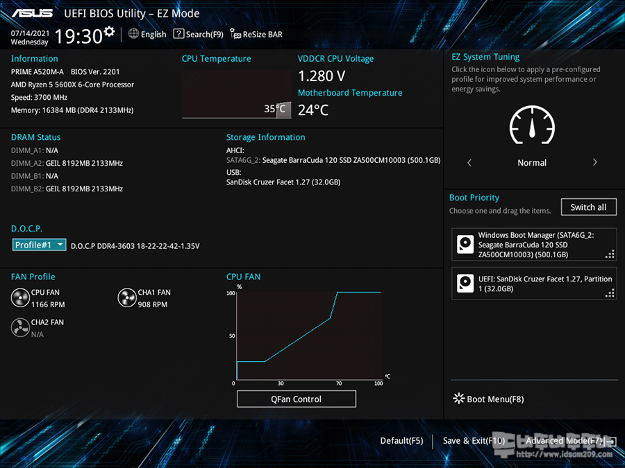ASUS PRIME A520M-A 대원 CTS 메인보드는 XMP (DOCP) 프로파일 설정으로 간단하게 메모리 오버가 가능하며 최신 펌웨어로 5600X도 사용 가능했습니다.