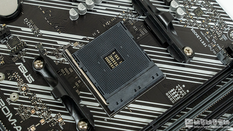라이젠 3000 시리즈, 4000 시리즈 GPU를 내장하는 4000 G 시리즈 프로세서를 사용할 수 있는 AM4 소켓 모습.