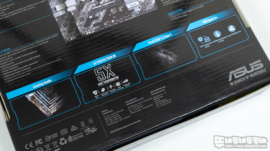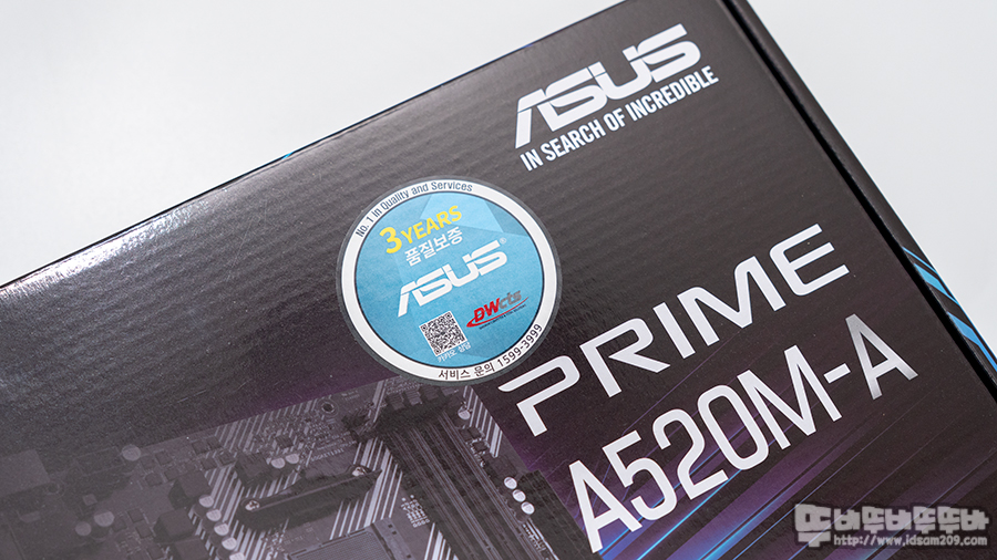 ASUS PRIME A520M-A 대원 CTS 메인보드 패키지에는 제품의 특징을 잘 표현하는 모델명과 A520 칩셋 사용 및 라이젠 3세대 이상 CPU 지원 및 3년의 서비스 보증기간을 안내하고 있습니다.