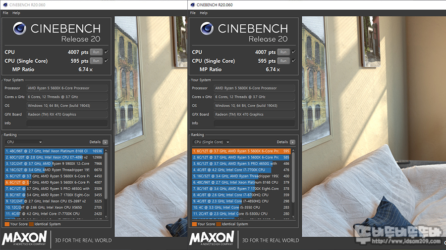 CPU-Z과는 살짝 다른 싱글코어 595 pts, 멀티 코어 4,007 pts를 보여주고 있습니다.