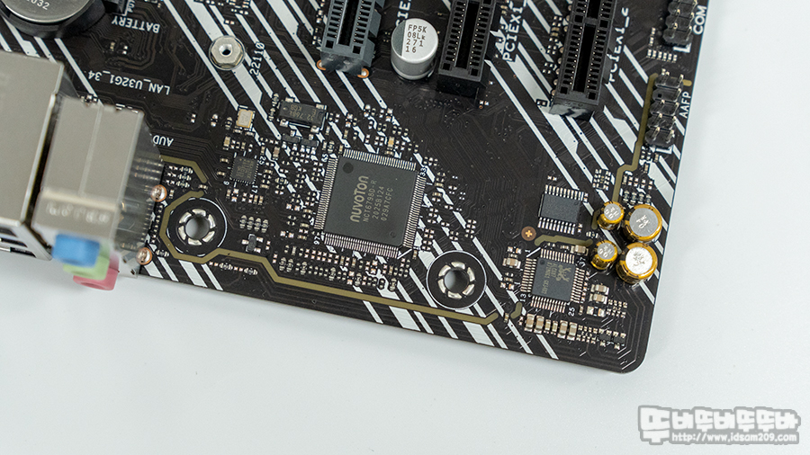 메인보드 24핀 커넥터 옆에는 케이스 전면에 사용하게 되는 USB 3.2 Gen1 헤더가 위치하고 있으며 보드 하단부에는 USB 2.0 커넥터 2개와 케이서 전면의 I/O 커넥터 그리고 SATA 6Gb/s를 지원하는 SATA 커넥터 4개를 지원하고 있습니다.