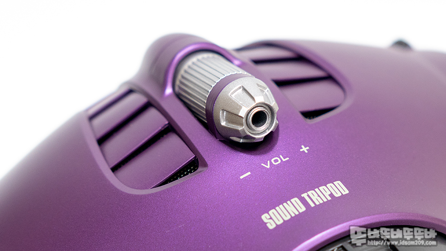 SOUNDTRIPOD 블루투스 스피커는 미드 베이스를 담당하는 메인 유닛 스피커가 큼지막하게 위치하고 있으며 LED 라이팅 버튼을 통해 다이나믹 라이트를 지원합니다.