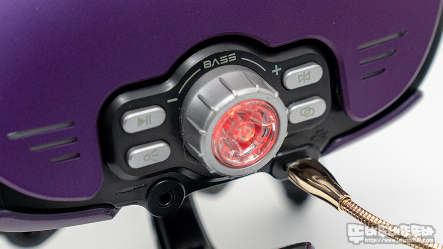 중앙에 눌러서 작동하는 전원 On/Off 스위치는 핸즈프리 시 스피커와 스마트폰의 통화 기능을 전환하는 기능도 겸하며, 버튼 주변에는 베이스 볼륨을 조절하는 볼륨 노브 기능을 지원합니다.