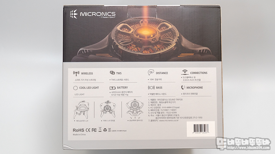 마이크로닉스 SOUNDTRIPOD 블루투스 스피커 패키지는 실물 이미지와 제품의 특징을 아이콘으로 설명하고 있습니다.