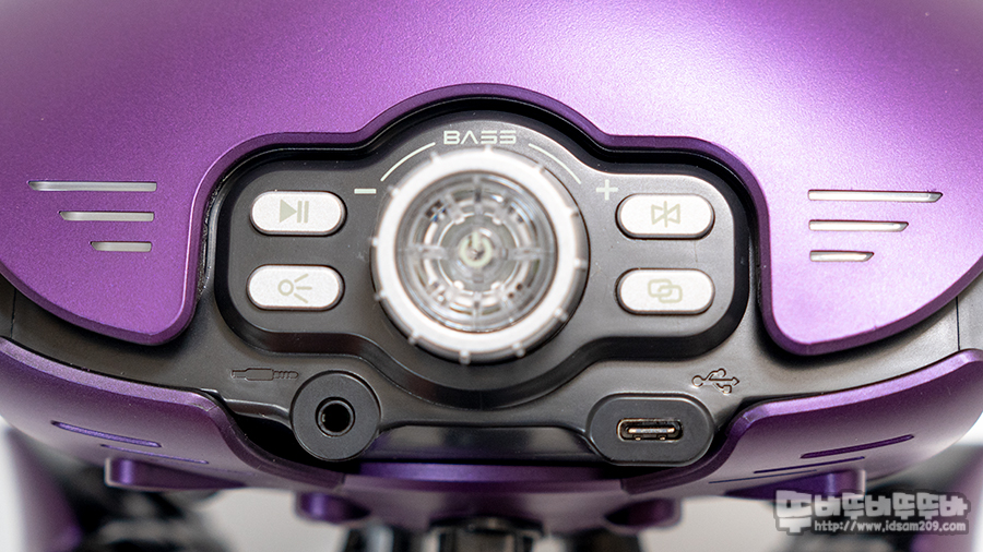 SOUNDTRIPOD 블루투스 스피커 뒷면에 조작부는 중앙에 눌러서 작동하는 전원 버튼, 베이스 볼륨 노브를 기준으로 왼쪽에 재생/일시 정지, LED 라이팅, 오른쪽에 블루투스 페어링, TWS 버튼 그리고 그 아랫부분에 AUX 단자와 USB-C 충전단자로 구성되어있습니다.