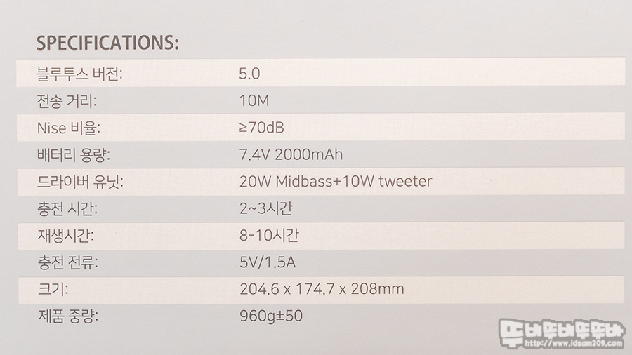 블루투스 버전 5.0 / 출력 30W (미들 베이스 20W + 트위터 10W) / 외부 입력 AUX / 듀얼 스피커 TWS 지원 / 음악 재생 및 전화 통화 / LED 라이팅 지원 / 재생 시간: 4~6시간 (볼륨 70% 기준) / 배터리 7.4V 2,000mAh / 충전 시간 2~3시간 / 충전 단자 : USB-C, 5V/2A / 사이즈 204.6 X 174.7 X 208mm / 무게 960g±50 등의 내용을 확인할 수 있는데요.