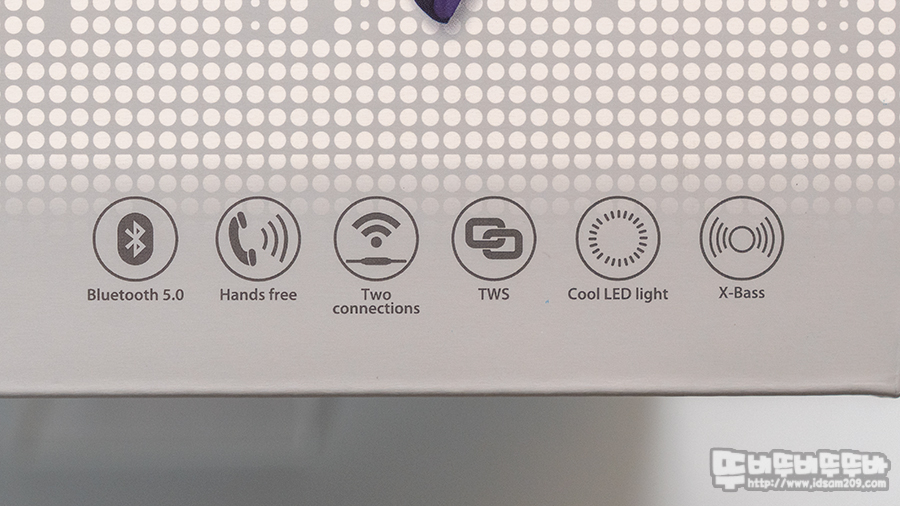 블루투스 5.0 / 핸즈프리 / 블루투스 & AUX 연결 / TWS 기능 / LED 라이팅 / X-Bass 지원 설명.