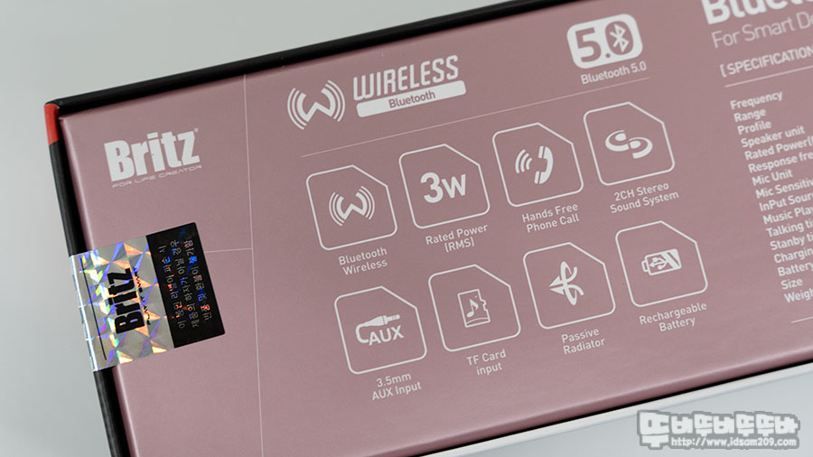 패키지 바닥면에 모든 정보가 있어 대표적으로 살펴보면 블루투스 5.0, RMS 3W, 핸즈프리, 2 채널 스테레오, 3.5mm AUX, TF Card 지원, 패시브 라디에이터, 배터리 내장 등의 포인트 설명과 스펙 정보를 확인할 수 있는데요.