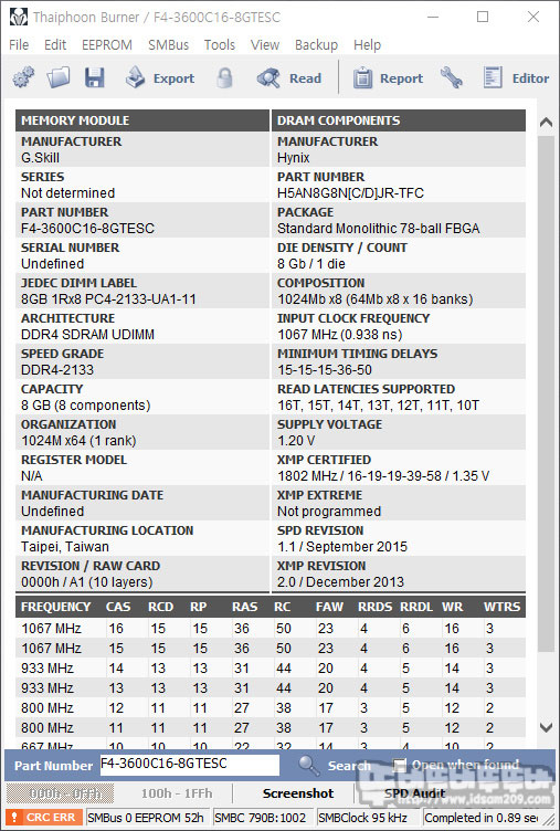 타이푼 버너로 메모리 정보 확인 시 하이닉스 메모리로 확인되는데 추측하기론 C/D 표기가 다이 표기인 듯 보이며 최상의 메모리로 선별된 제품이기에 성능이 기대됩니다.