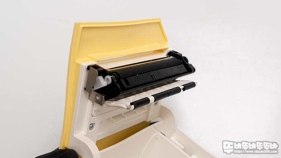 라벨 프린터 아래쪽에는 프린트 헤드가 위치하여 감열 라벨지 표면에 인쇄를 담당하게 되며 상단 커버에는 라벨지를 당기는 롤러와 오토 컷팅을 담당하는 장치로 구성되어있습니다.