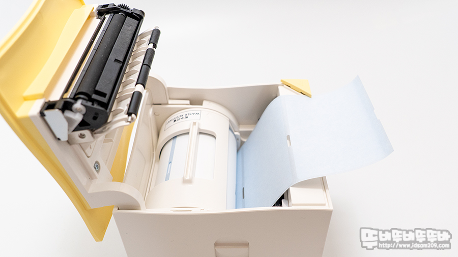 이후에는 상단 커버의 용지 배출 홀에 라벨지를 적당히 끼워주고 커버를 닫아주면 준비 끝!!