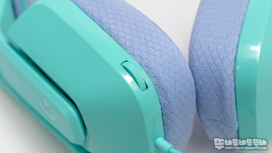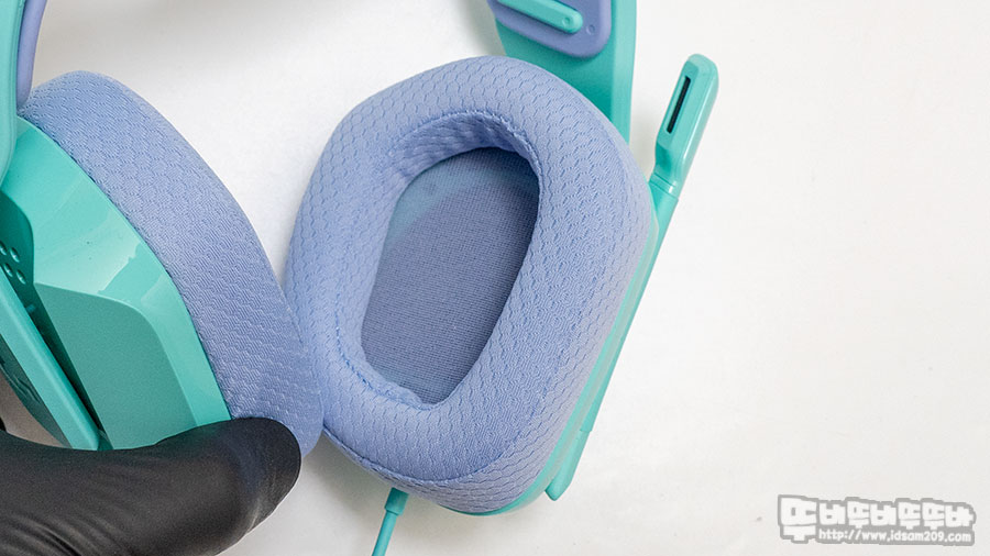 헤드셋 착용 시 귀 연골을 누르는 압박감(장력), 이어컵 하우징이 고정된 형태일 경우 귓 바퀴가 있는 아래쪽을 누르는 느낌으로 착용되어 30분이 지나면 귀가 얼얼한 느낌을 주었지만, 로지텍 G335 민트 게이밍 헤드셋은 약간의 틸트가 적용되는 이어컵 하우징과 두툼하고 부드러운 이어패드가 귀 주변을 균등하게 밀착시키는 오버이어 형태로 착용 되기에 1시간이 넘는 시간에도 편안함을 주었습니다.
