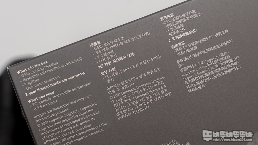 제품은 G335 헤드셋 본체, 4극 to 3극 변환 스플리터 케이블, 로지텍 스티커로 구성되어있습니다.