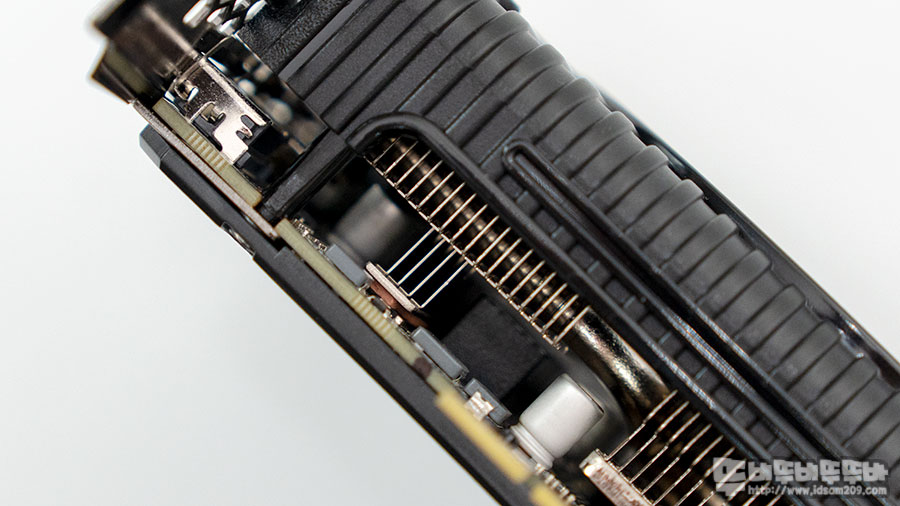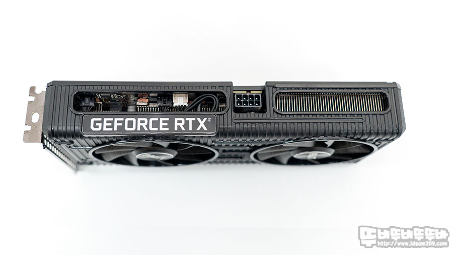 3060 제품은 사실 8핀 보조전원 단자가 기판의 마지막 부분이지만 히트싱크와 히트파이프로 구성된 냉각 디자인으로 245mm 길이를 갖게 되었습니다.