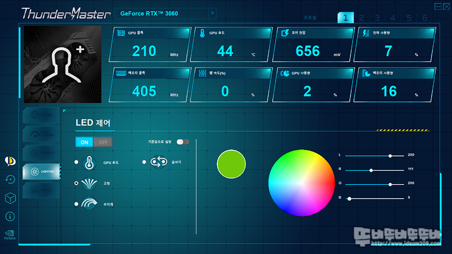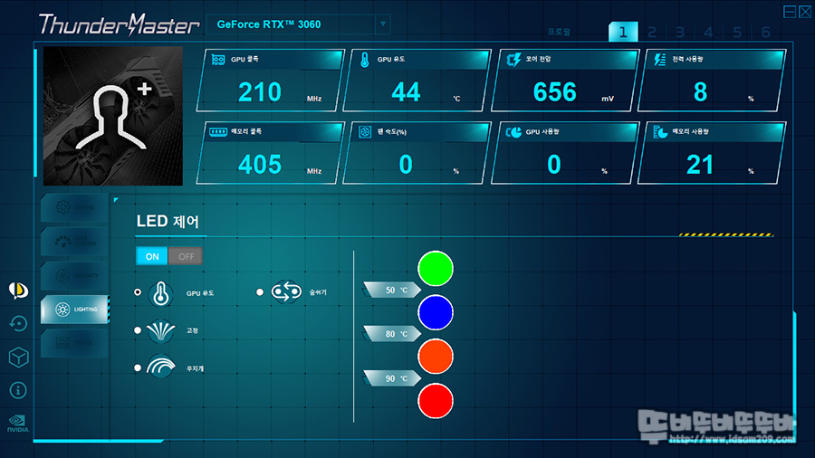 팰릿 제품의 전용 소프트웨어인 ThunderMaster를 설치하면 그래픽카드의 GEFORCE RTX 로고의 LED 라이팅 효과를 컨트롤할 수 있는데요.