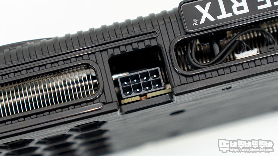 그래픽카드 중앙에 8핀 보조전원을 사용하며 GEFORCE RTX 로고에 LED 백라이트를 지원하여 케이스 내부에 블링블링하게 해주는 특별함이 있습니다.