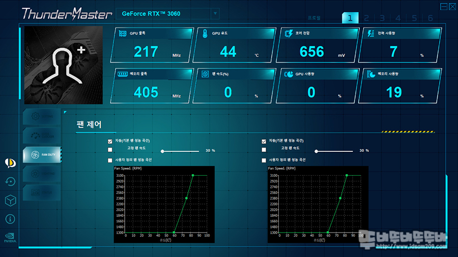 또한 팬 컨트롤 메뉴를 통해 자동 값 또는 고정값으로 사용자가 그래픽카드의 쿨링 상태를 선택할 수 있습니다.