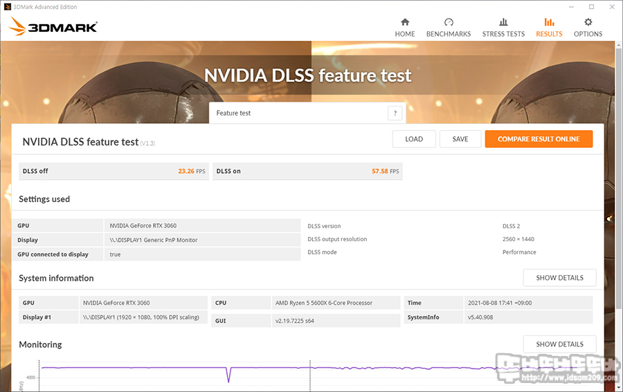 NIVDA DLSS 테스트에서는 On 시 57.58 FPS, Off 시 23.26 FPS를 보여주었습니다.