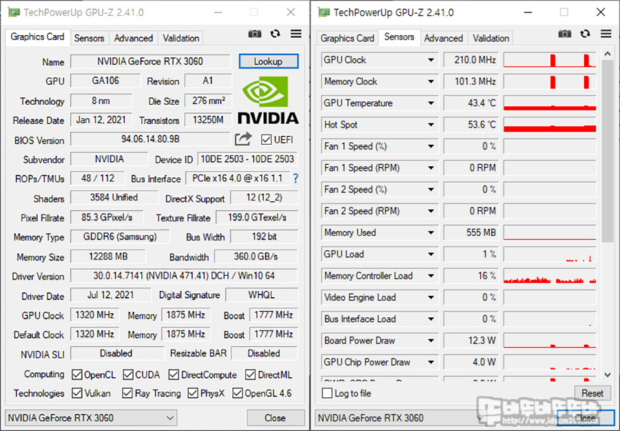 GPU-Z에서는 베이스클럭: 1320MHz / 부스트클럭: 1777MHz / 스트림 프로세서(CUDA 코어): 3584개 정보를 확인할 수 있습니다.