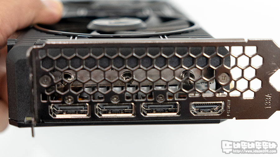 2 슬롯 브라켓에는 Display Port 1.4 3개와 HDMI 2.1 포트 1개로 구성되어 최대 7680 X 4320 해상도를 지원 및 HDR, HDCP 2.3 지원으로 게임과 영화 감상을 하는데 부족함이 없이 화면을 제공하며 NVIDIA G-SYNC를 이용한 모니터를 사용한다면 게임 화면에 티어링이 없는 부드러운 화면으로 게임을 하는데 도움이 됩니다.