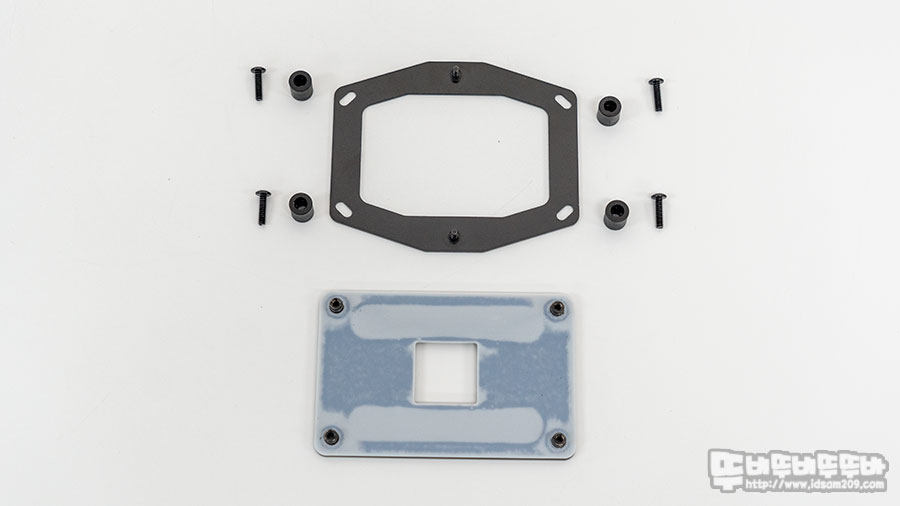 메인보드의 기본 가이드를 분리하고 뒷면에 부착된 백플레이트에 플라스틱 원기둥 스탠드오프를 세우고 AMD 마운팅 플레이트를 올려 나사로 고정해주면 베이스 작업이 완료됩니다.