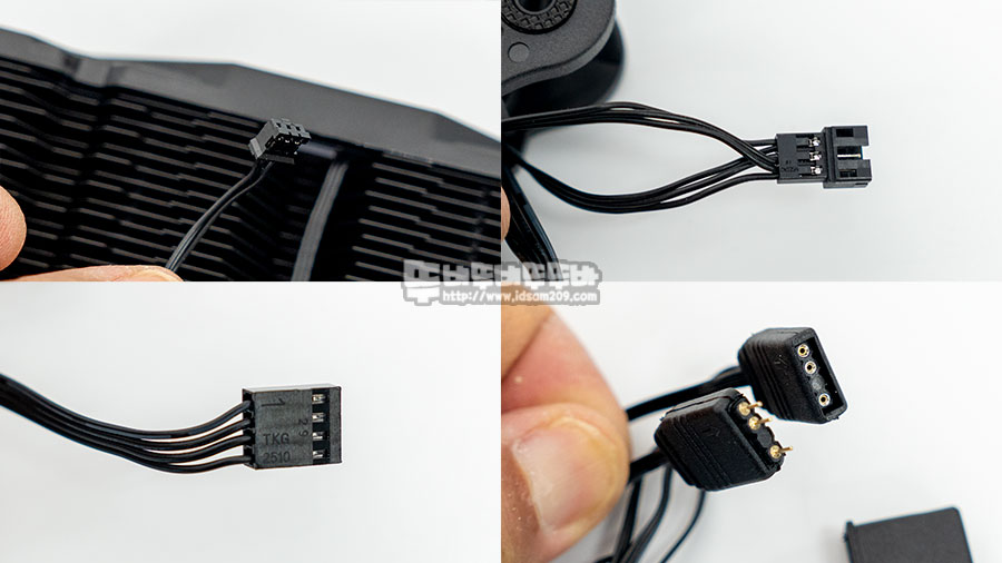 에너맥스 ETS-F40-FS ARGB CPU 쿨러의 연결 커넥터를 살펴보면 쿨러 상단에 ARGB 캡에서 나오는 3핀 커넥터 → 140mm 쿨링 팬의 ARGB 케이블에 3핀 소켓과 결합 → 메인보드 ARGB 5V (3핀) 커넥터에 연결하는 구조로 되어있으며 쿨링 팬 작동은 PWM 4핀 커넥터를 메인보드의 CPU_FAN 소켓에 연결할 수 있게 구성되어있습니다.