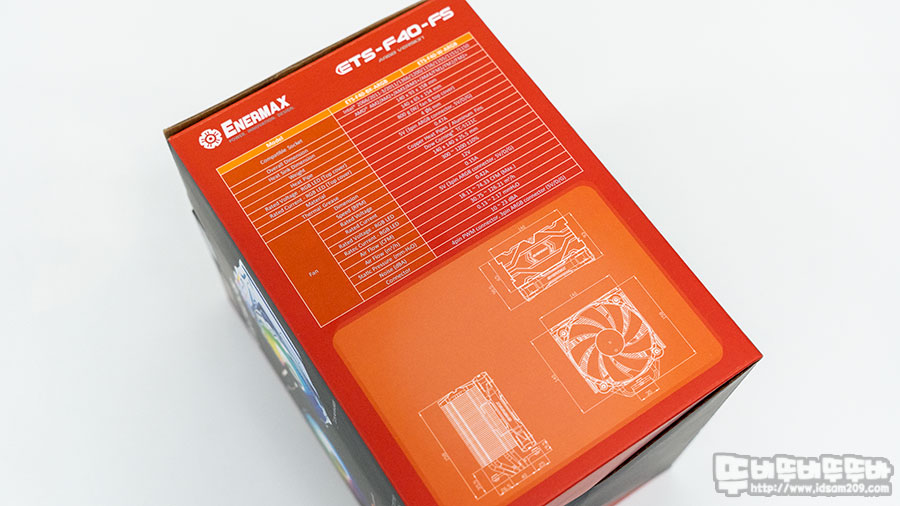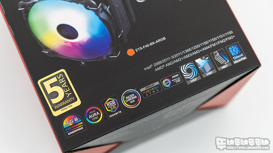 에너맥스 ETS-F40-FS ARGB CPU 쿨러 패키지 전면에는 제품의 모델과 컬러 표시 5년 서비스 보증 그리고 Addressable RGB 지원 내용, 쿨러에 적용된 VGF, VEF, HDT, 저소음 쿨링팬 그리고 인텔과 AMD 지원 소켓 정보를 확인할 수 있습니다.