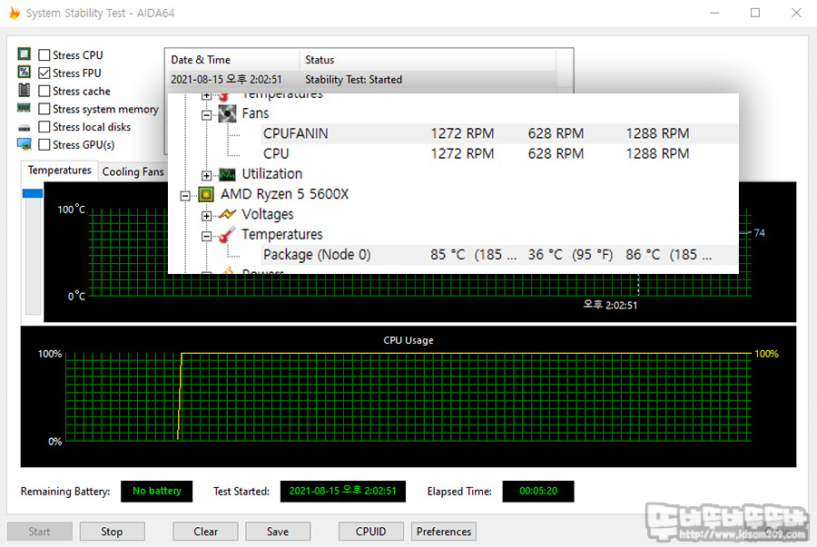 AMD 기본 쿨러로 테스트 시 Stress CPU 테스트에서는 81도, 부동소수점 테스트로 CPU를 극한으로 테스트하는 Stress FPU 테스트에서는 95도까지 오르는 것을 확인할 수 있었는데요.