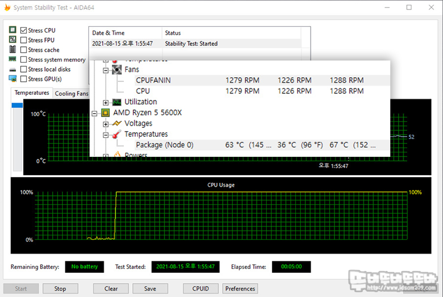 에너맥스 ETS-F40-FS ARGB CPU 쿨러를 장착하여 테스트 시 Stress CPU 테스트에서는 63도, Stress FPU 테스트에서는 85도 상당히 안정적인 온도를 보여주고 있습니다.