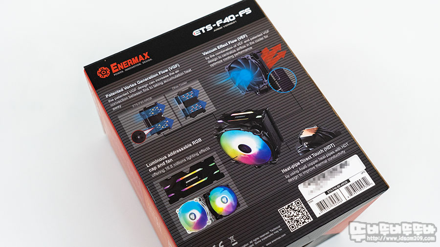 패키지 뒷면에는 촘촘한 히트싱크에 고속으로 유입되는 차가운 공기가 뜨거운 공기를 높은 풍량으로 배출하는 VEF (Vacuum Effect Flow) 설계 적용, 히트파이프를 감싸면서 흘러가는 공기 흐름을 만들어내는 VGF (Vortex Generation Flow) 특허 기술 적용, 히트파이프가 CPU 히트스프레더 표면과 직접 닿아 빠르게 냉각하는 HDT (Heat Pipe Direct Touch) 그리고 쿨러 상단 캡 부분과 쿨링팬에 동시에 표현되는 Addressable RGB에 대한 내용이 언급되어있습니다.
