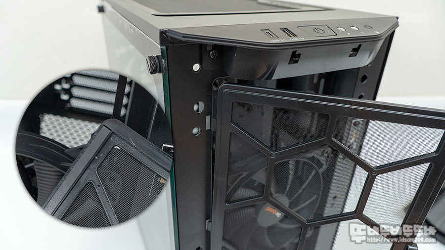 케이스를 디테일하게 살펴보자면 먼저 상단에 탈부착이 가능한 먼지 필터를 볼 수 있는데요.