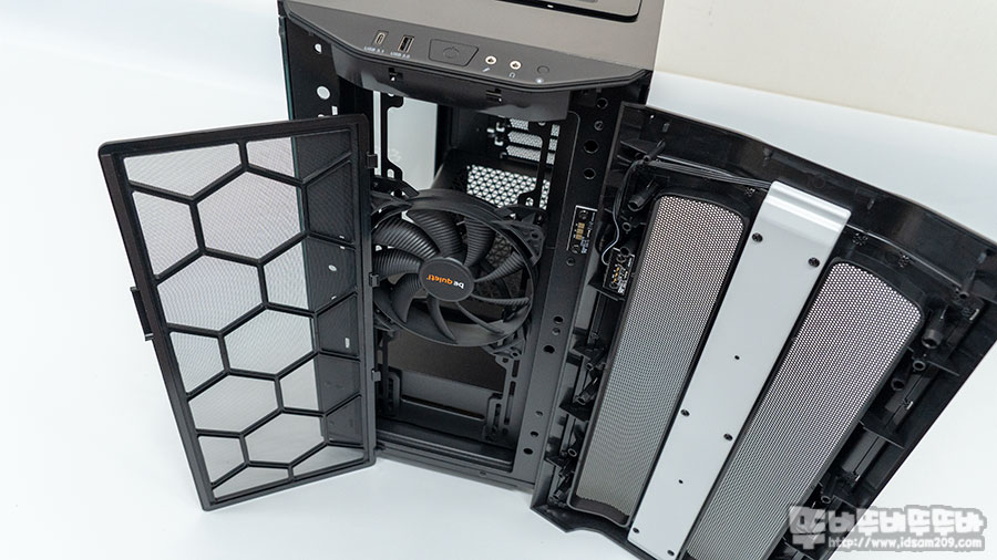 전면 먼지 필터는 샤시에 끼워서 고무 자석으로 고정되는 형태로 탈부착할 수 있게 디자인되었는데 상단/하단/전면의 먼지 필터는 탈부착이 가능한 구조로 간편하게 청소할 수 있습니다.