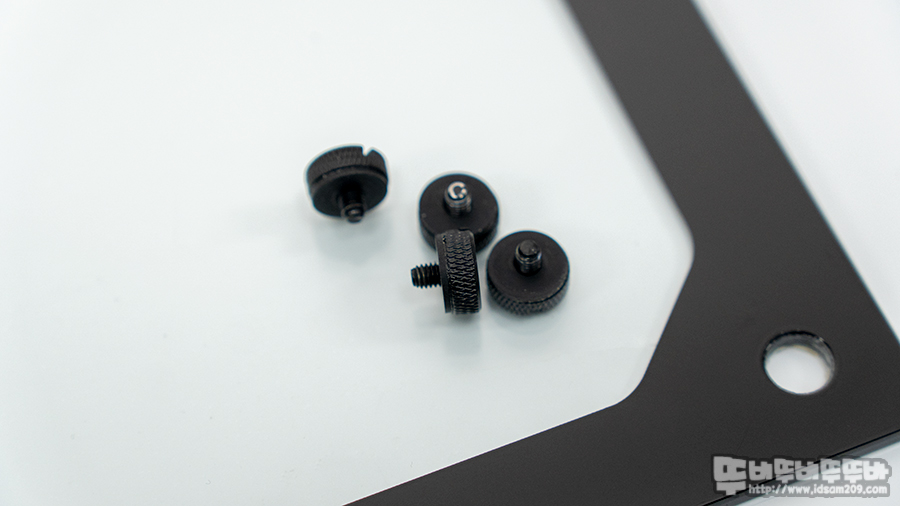 be quiet이라는 이름 때문인지 철재 사이드 패널 안쪽에는 소음을 방지하는 패드가 사용되었고 강화유리 사이드 패널의 경우 실리콘 가이드를 사용하여 강화유리를 고정 후 실리콘 와샤가 사용된 두툼한 나사를 이용하여 안정적인 결합을 해주고 있습니다.