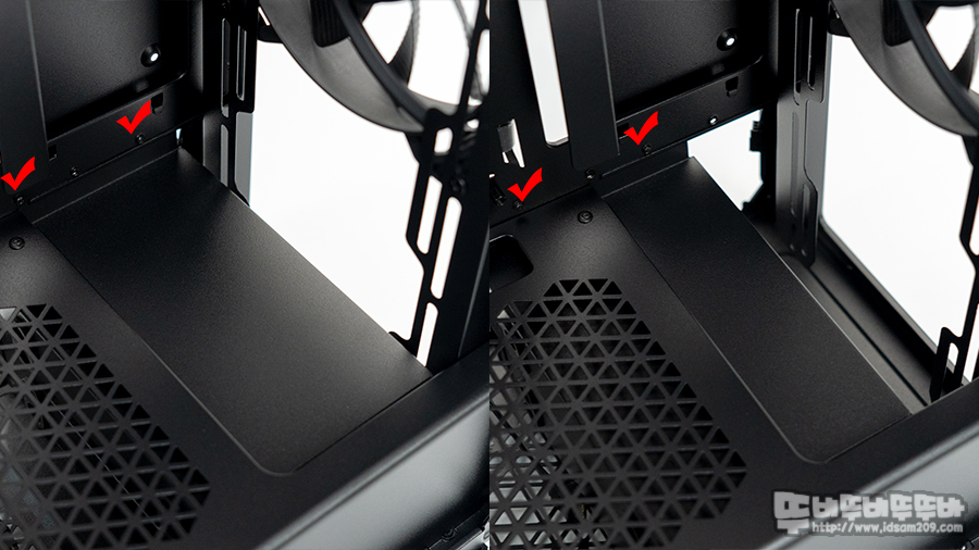 하단 챔버 앞쪽에 위치한 HDD 가이드는 샤시면에 고정 나사를 풀고 슬라이딩 방식으로 고정된 가이드를 잡아당겨 분리할 수 있으며 전면 쿨링 팬 빌드에 따라 약간의 위치 이동이 가능하게 디자인되었으며