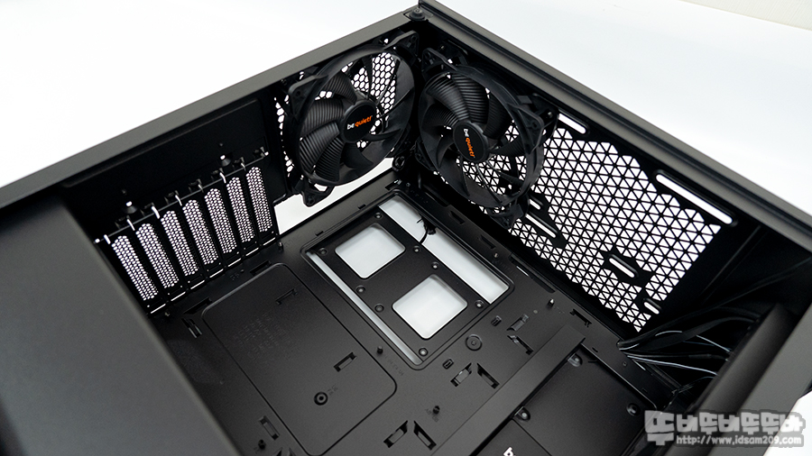 샤시 상단에는 120mm 또는 140mm 쿨러 2개 구성 또는 120 / 240mm 수냉 쿨러를 지원하며 기본으로 140mm PURE Wing 2 쿨러가 장착되어있습니다.